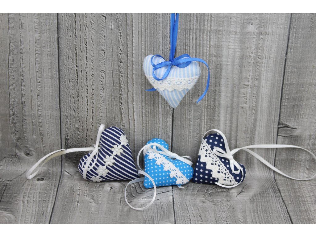 Dekorační látková srdíčka sladěné do modrých barev.